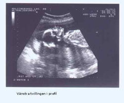 Åker in och då görs ett VUL, läkaren säger att, det måste vara nåt fel, de här är inte döda, här är två fullt levande foster. Men herre gud, de sa att en hinna var tom och det andra fostret var dött för tre veckor sen. Hon sa att det är väldigt vanligt att man felbedömmer när man gör vanliga ul så tidigt, det skulle ju inte gjorts så, om han nu såg ett dött foster skulle han ha skickat dig vidare, för att få en ordentlig kontroll.